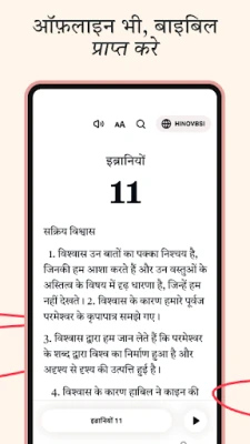 इस ऐप के साथ, पवित्र बाइबिल की शिक्षाएं आपकी उंगलियों पर रहती हैं। चाहे आप यात्रा कर रहे हों या किसी दूरस्थ स्थान पर हों, आप इंटरनेट कनेक्शन के बिना भी बाइबिल के किसी भी अध्याय या पद तक पहुँच सकते हैं। जो लोग सुनना पसंद करते हैं, उनके लिए इसमें ऑडियो बाइबिल सुविधा भी शामिल है, जिससे आप पवित्र ग्रंथों को सुन सकते हैं और गहरे अर्थों को आत्मसात कर सकते हैं (ऑडियो स्ट्रीमिंग के लिए इंटरनेट आवश्यक है)। अपने पसंदीदा छंदों को हाइलाइट और सहेज कर अपने सीखने के अनुभव को निजीकृत करें, ताकि आप भविष्य में उन पर चिंतन कर सकें।