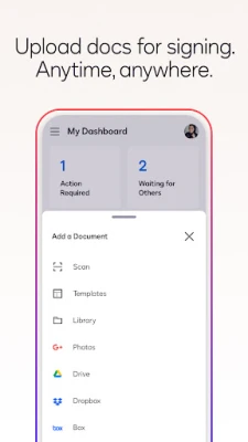 अपने डिजिटल हस्ताक्षर को सीधे अपने डिवाइस पर सहजता से बनाएं। आप ईमेल, Google Drive, DropBox, Box, Evernote, Salesforce या फ़ोटो स्कैनिंग के माध्यम से किसी भी दस्तावेज़ को आसानी से अपलोड कर सकते हैं, और फिर बिना किसी मासिक सीमा के उन पर मुफ्त में ई-हस्ताक्षर कर सकते हैं। समझौतों को भेजने के लिए, फ़ाइलों को आयात करें और उन्हें "यहां हस्ताक्षर करें" जैसे सटीक टैग के साथ तैयार करें, जो दर्शाते हैं कि कहाँ हस्ताक्षर करना है, आद्याक्षर जोड़ना है या अतिरिक्त जानकारी दर्ज करनी है। आप कई हस्ताक्षरकर्ताओं के लिए हस्ताक्षर क्रम और कार्यप्रवाह भी निर्धारित कर सकते हैं, चाहे वे व्यक्तिगत रूप से हों या दूरस्थ स्थानों पर। "Docusign" आपको हस्ताक्षरों के लिए भेजे गए दस्तावेज़ों को ट्रैक करने, हस्ताक्षरकर्ताओं को एक टैप से याद दिलाने या आवश्यकता पड़ने पर दस्तावेज़ को रद्द करने, और वास्तविक समय की पुश सूचनाओं के माध्यम से हस्ताक्षरित होने पर तुरंत सूचित करने की सुविधा देता है।
