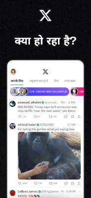 X एक गतिशील वैश्विक मंच है जहाँ विचार जीवंत होते हैं और संबंध पनपते हैं। यहाँ आप दुनिया भर के लाखों लोगों के साथ अपनी सामग्री साझा कर सकते हैं और सार्वजनिक संवादों में सक्रिय रूप से भाग ले सकते हैं। नवीनतम समाचारों, ट्रेंडिंग विषयों से हमेशा अवगत रहें, और अपनी पसंदीदा हस्तियों, ब्रांडों या रुचियों का अनुसरण करके अपनी फीड को अनुकूलित करें। X पर आप हर पल की धड़कन के साथ जुड़े रहते हैं, चाहे वह कोई बड़ा घटनाक्रम हो या कोई छोटी सी चर्चा।